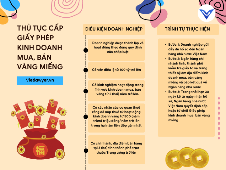 0927625666Thủ tục cấp giấy phép kinh doanh mua, bán vàng miếng | Giấy phép con - Kinh doanh mua, bán vàng miếng là ngành, nghề đầu tư kinh doanh có điều kiện. Các doanh nghiệp mới thành lập hoặc chuyển sang kinh doanh mua, bán vàng miếng cần đề nghị Cấp giấy phép kinh doanh tại cơ quan có thẩm quyền. Công ty luật VietLawyer sẽ cung cấp cho khách hàng về thủ tục Cấp giấy phép kinh doanh mua, bán vàng miếng dưới đây.