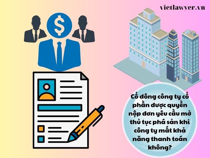 Đồng thời cổ đông hoặc nhóm cổ đông sở hữu dưới 20% số cổ phần phổ thông trong thời gian liên tục ít nhất 06 tháng có quyền nộp đơn yêu cầu mở thủ tục phá sản khi công ty cổ phần mất khả năng thanh toán trong trường hợp Điều lệ công ty quy định.