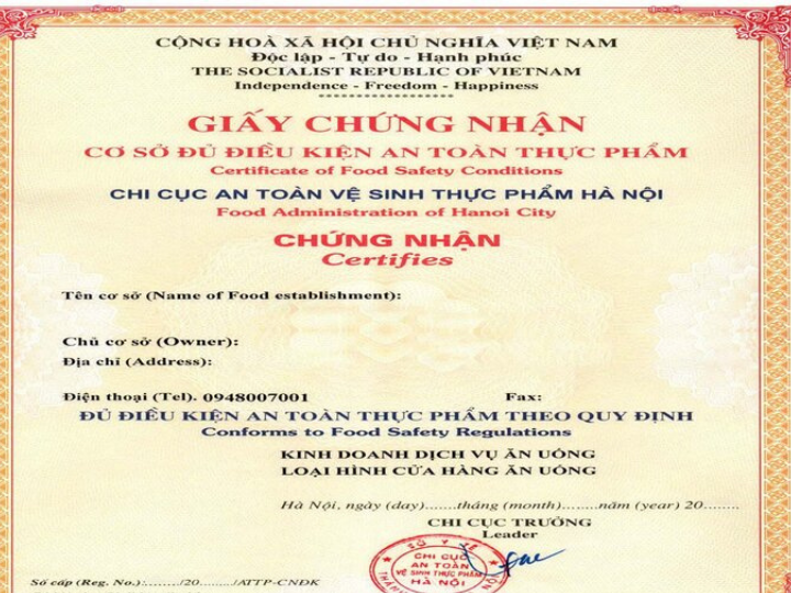 - Thời hạn của tất cả các giấy chứng nhận vệ sinh an toàn thực phẩm hiện nay là 3 năm