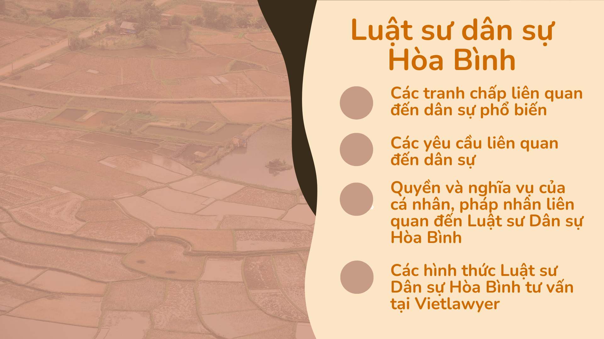 Tại đây, Luật sư dân sự Hòa Bình là những luật sư tại Công ty luật Vietlawyer có chuyên môn trong lĩnh vực dân sự, với nhiều năm kinh nghiệm và thực hiện các vụ việc lớn tại nhiều tỉnh thành. trong đó có tỉnh Hòa Bình. Các luật sư dân sự Hòa Bình có thể tư vấn và đại diện cho khách hàng trong các vụ việc pháp lý liên quan đến vụ việc dân sự, bao gồm: các vấn đề liên quan đến quyền sở hữu/sử dụng tài sản, giao dịch dân sự, hôn nhân gia đình, kinh doanh thương mại, lao động, quyết định hành chính và các vấn đề dân sự khác, giúp khách hàng giải quyết các vấn đề pháp lý một cách nhanh chóng và hiệu quả.