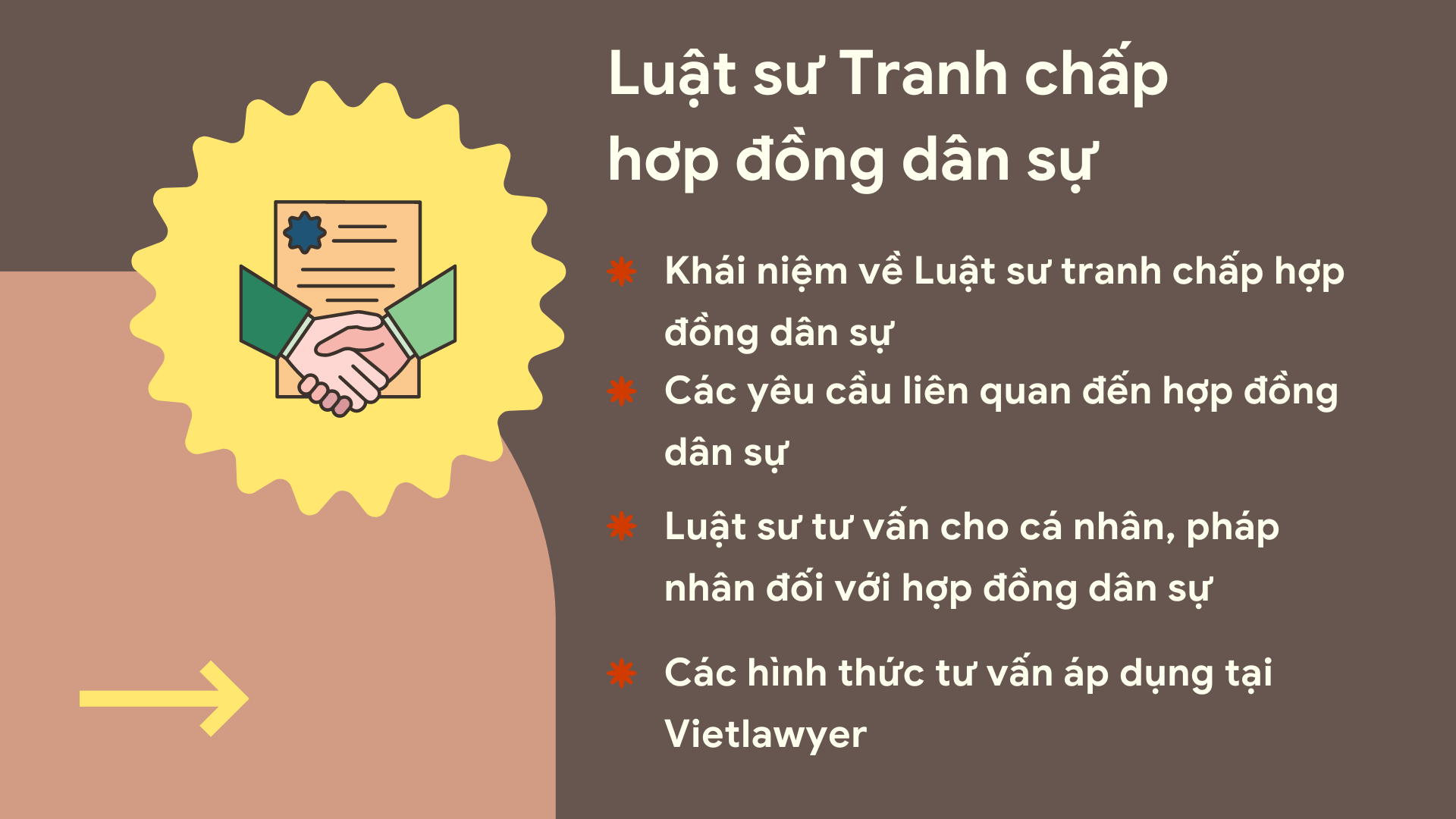 0927625666Luật sư tranh chấp hợp đồng dân sự là luật sư tư vấn pháp lý, hướng dẫn, soạn thảo hợp đồng, đưa ra các ý kiến, giải pháp bảo vệ quyền và lợi ích hợp pháp đối với một bên trong hợp đồng dân sự.