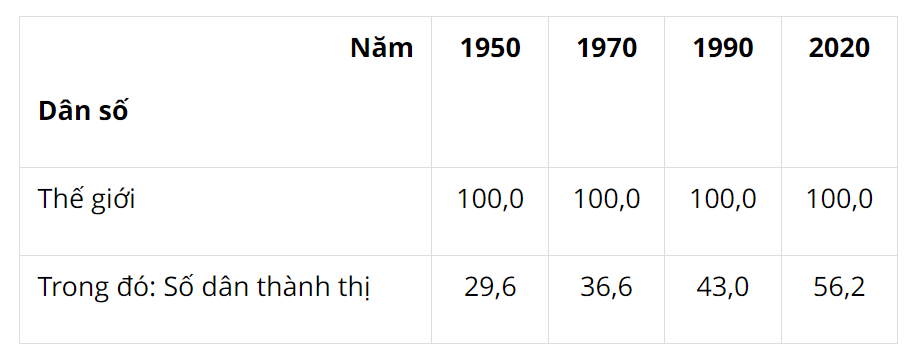 Tỉ lệ dân thành thị của thế giới giai đoạn 1950 - 2020 (Đơn vị: %)