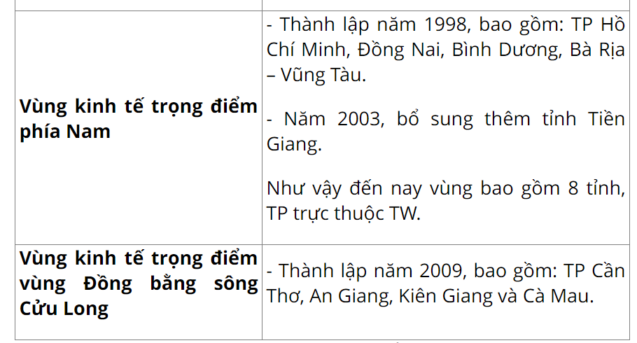 - Các vùng kinh tế trọng điểm gồm nhiều tỉnh, thành phố trực thuộc Trung ương, có ranh giới cụ thể và có thể thay đổi tuỳ theo chiến lược phát triển kinh tế - xã hội từng thời kì của đất nước.
