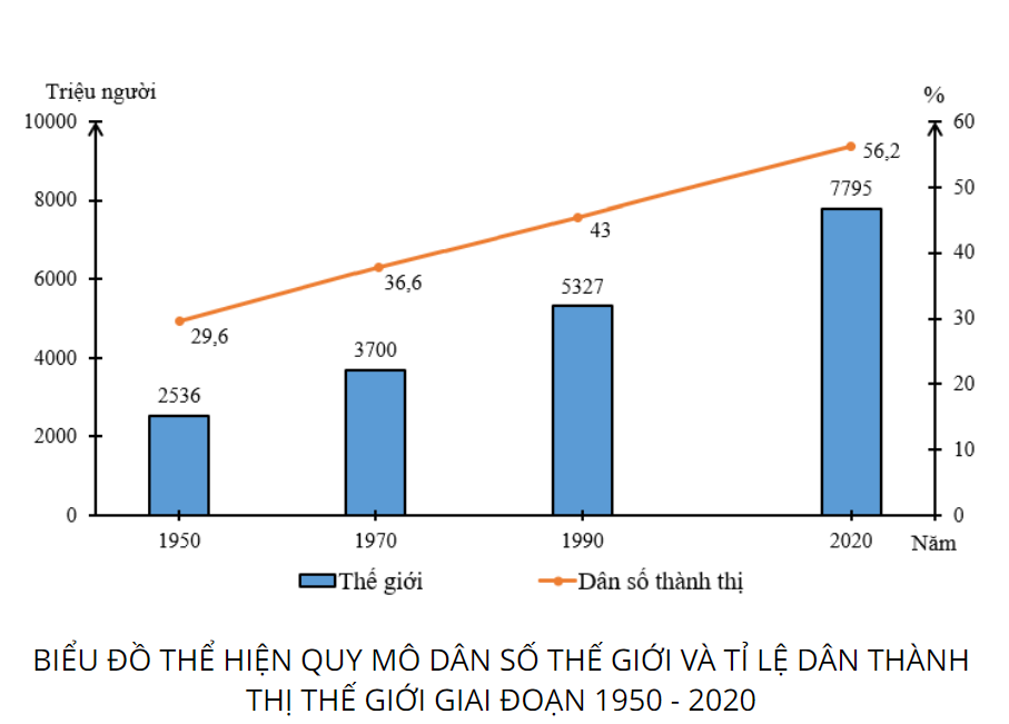 Vẽ biểu đồ kết hợp (cột và đường) thể hiện quy mô dân số thế giới và tỉ lệ dân thành thị thế giới giai đoạn 1950 - 2020.