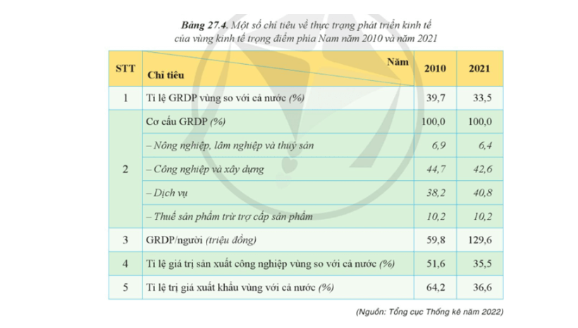 Nhận xét và giải thích: Nhìn chung vùng kinh tế trọng điểm phía Nam có cơ cấu GRDP năm 2021 hiện đại với tỉ trọng ngành công nghiệp xây dựng và dịch vụ cao, tỉ trọng ngành nông nghiệp, lâm nghiệp và thủy sản thấp, cụ thể: