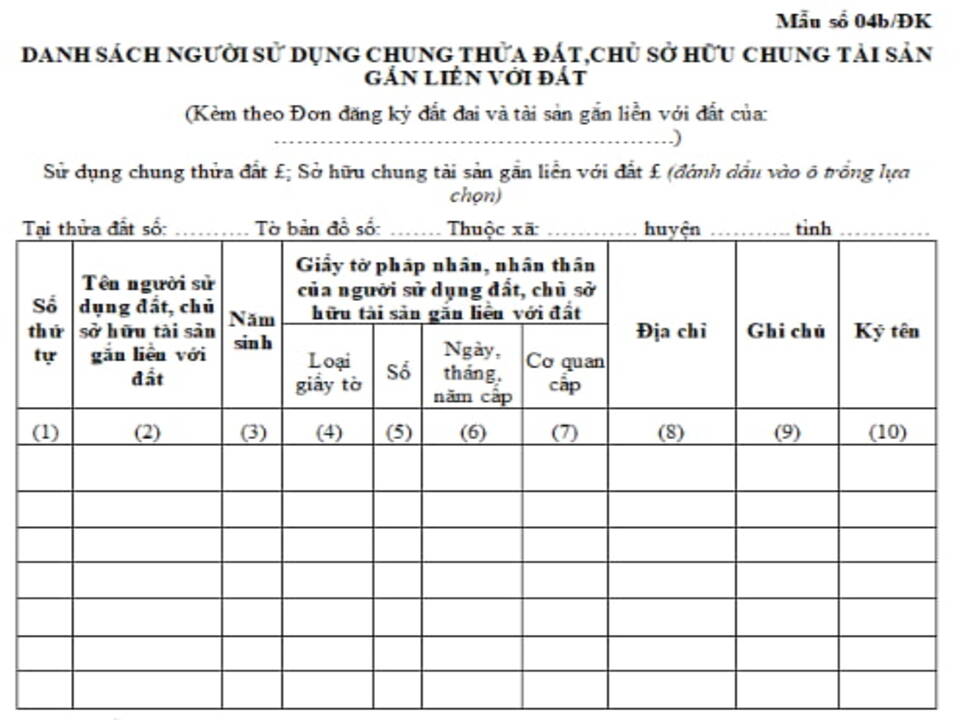 - Danh sách người sử dụng chung thửa đất, chủ sở hữu chung tài sản gắn liền với đất theo Mẫu số 04b/ĐKban hành kèm theo Thông tư 24/2014/TT-BTNMT.