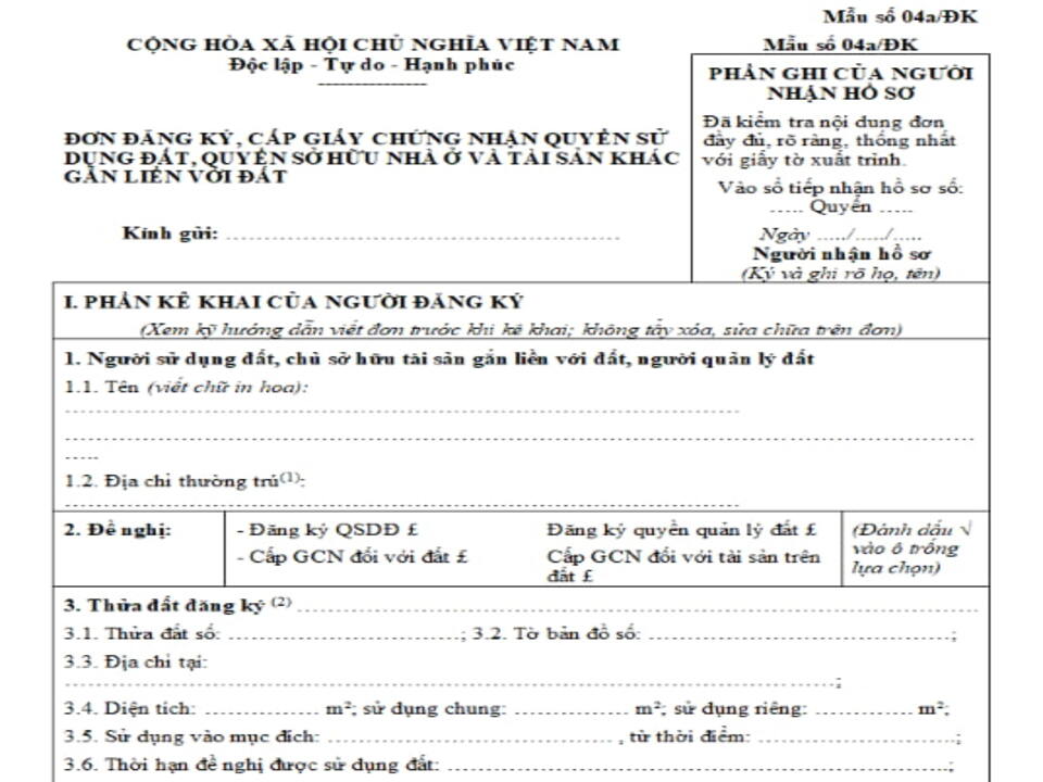 - Đơn đăng ký, cấp Giấy chứng nhận quyền sử dụng đất, quyền sở hữu nhà ở và tài sản khác gắn liền với đất theo Mẫu số 04a/ĐK ban hành kèm theo Thông tư 24/2014/TT-BTNMT và công khai trên Trang thông tin điện tử của Bộ Tài nguyên và Môi trường
