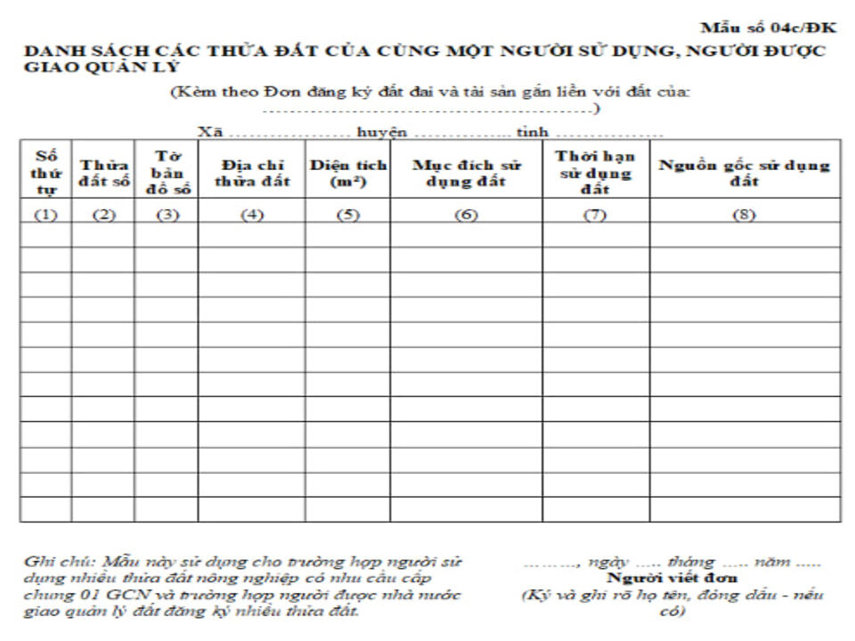 - Danh sách các thửa đất nông nghiệp của cùng một người sử dụng, người được giao quản lý đất theo Mẫu số 04c/ĐKban hành kèm theo Thông tư 24/2014/TT-BTNMT.