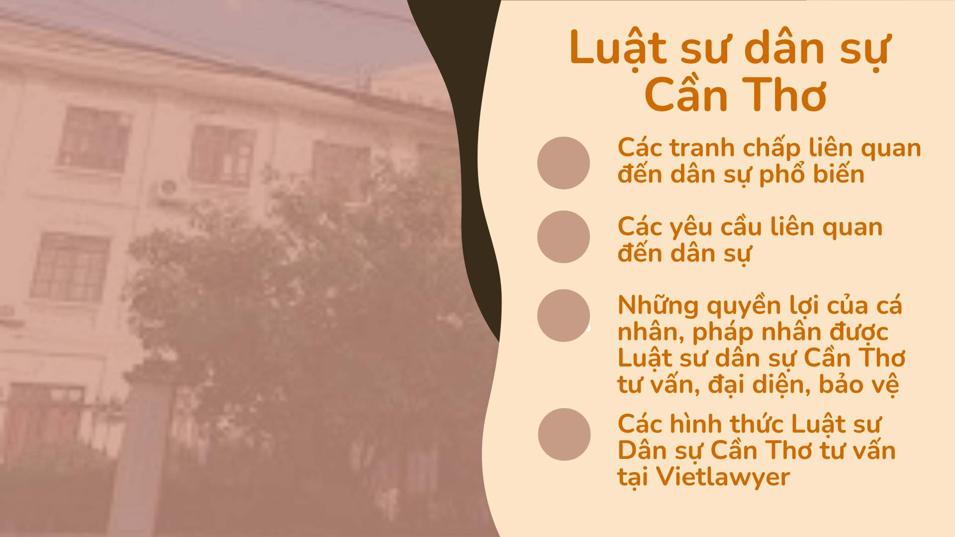 Tại đây, Luật sư dân sự Cần Thơ gồm những luật sư tại Công ty luật Vietlawyer có chuyên môn trong lĩnh vực dân sự, với nhiều năm kinh nghiệm và thực hiện các vụ việc lớn tại nhiều tỉnh thành. trong đó có tỉnh Cần Thơ. Các luật sư dân sự Cần Thơ có thể tư vấn và đại diện cho khách hàng trong các vụ việc pháp lý liên quan đến vụ việc dân sự, bao gồm: các vấn đề liên quan đến quyền sở hữu/sử dụng tài sản, giao dịch dân sự, hôn nhân gia đình, kinh doanh thương mại, lao động, quyết định hành chính và các vấn đề dân sự khác, giúp khách hàng giải quyết các vấn đề pháp lý một cách nhanh chóng và hiệu quả.