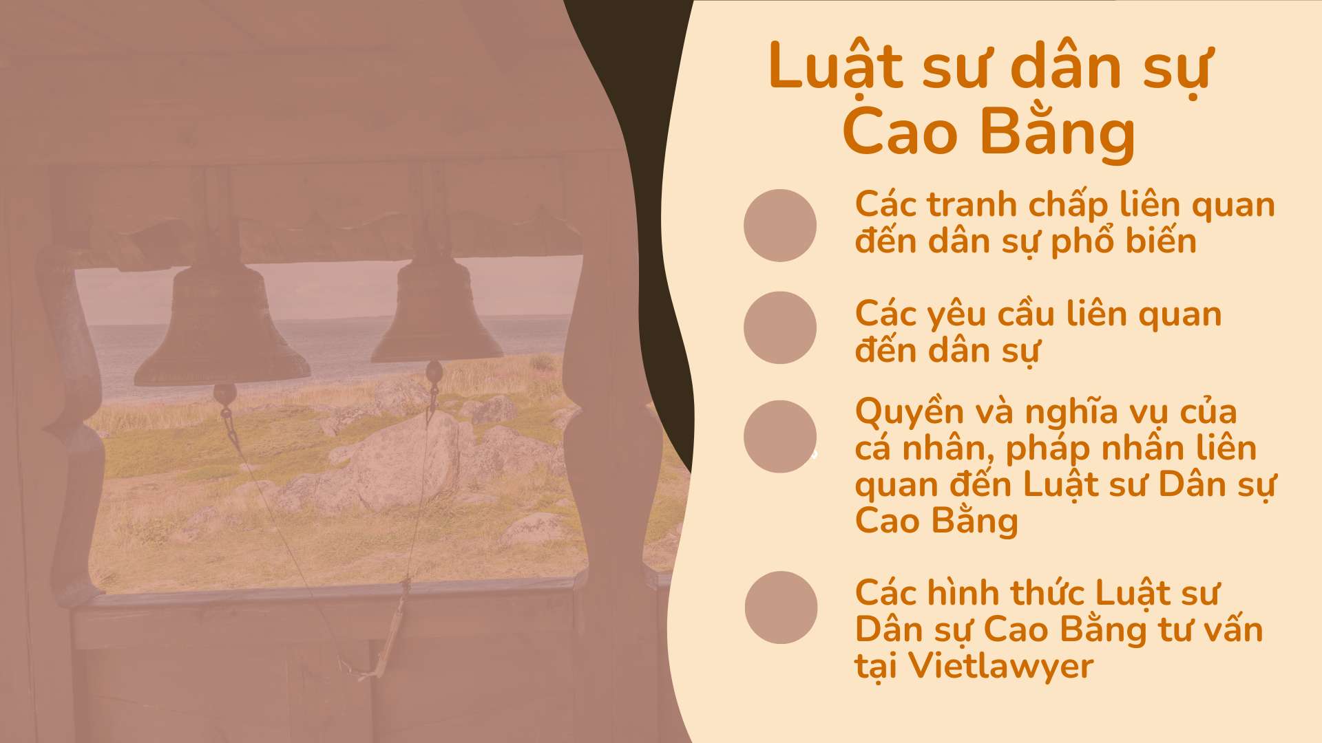 Tại đây, Luật sư dân sự Cao Bằng có những luật sư tại Công ty luật Vietlawyer có chuyên môn trong lĩnh vực dân sự, với nhiều năm kinh nghiệm và thực hiện các vụ việc lớn tại nhiều tỉnh thành. trong đó có tỉnh Cao Bằng. Các luật sư dân sự Cao Bằng có thể tư vấn và đại diện cho khách hàng trong các vụ việc pháp lý liên quan đến vụ việc dân sự, bao gồm: các vấn đề liên quan đến quyền sở hữu/sử dụng tài sản, giao dịch dân sự, hôn nhân gia đình, kinh doanh thương mại, lao động, quyết định hành chính và các vấn đề dân sự khác, giúp khách hàng giải quyết các vấn đề pháp lý một cách nhanh chóng và hiệu quả.