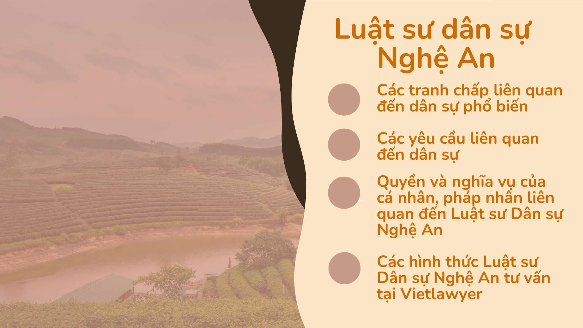 Tại đây, Luật sư dân sự Nghệ An gồm những luật sư tại Công ty luật Vietlawyer có chuyên môn trong lĩnh vực dân sự, với nhiều năm kinh nghiệm và thực hiện các vụ việc lớn tại nhiều tỉnh thành. trong đó có tỉnh Nghệ An. Các luật sư dân sự Nghệ An có thể tư vấn và đại diện cho khách hàng trong các vụ việc pháp lý liên quan đến vụ việc dân sự, bao gồm: các vấn đề liên quan đến quyền sở hữu/sử dụng tài sản, giao dịch dân sự, hôn nhân gia đình, kinh doanh thương mại, lao động, quyết định hành chính và các vấn đề dân sự khác, giúp khách hàng giải quyết các vấn đề pháp lý một cách nhanh chóng và hiệu quả.
