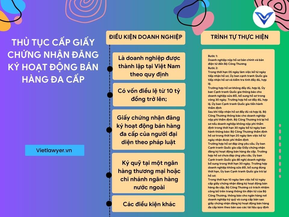 - Là doanh nghiệp được thành lập tại Việt Nam theo quy định của pháp luật và chưa từng bị thu hồi giấy chứng nhận đăng ký hoạt động bán hàng đa cấp;