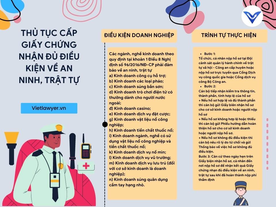 0927625666Thủ tục cấp Giấy chứng nhận đủ điều kiện về an ninh, trật tự | Giấy phép con - Một số ngành, nghề đầu tư kinh doanh cần đảm bảo điều kiện về an ninh, trật tự. Các doanh nghiệp mới thành lập hoặc chuyển sang các ngành, nghề cần đảm bảo điều kiện về an ninh, trật tự cần đề nghị Cấp Giấy chứng nhận tại cơ quan có thẩm quyền. Công ty luật VietLawyer sẽ cung cấp cho khách hàng về thủ tục Cấp chứng nhận đủ điều kiện về an ninh, trật tự dưới đây.