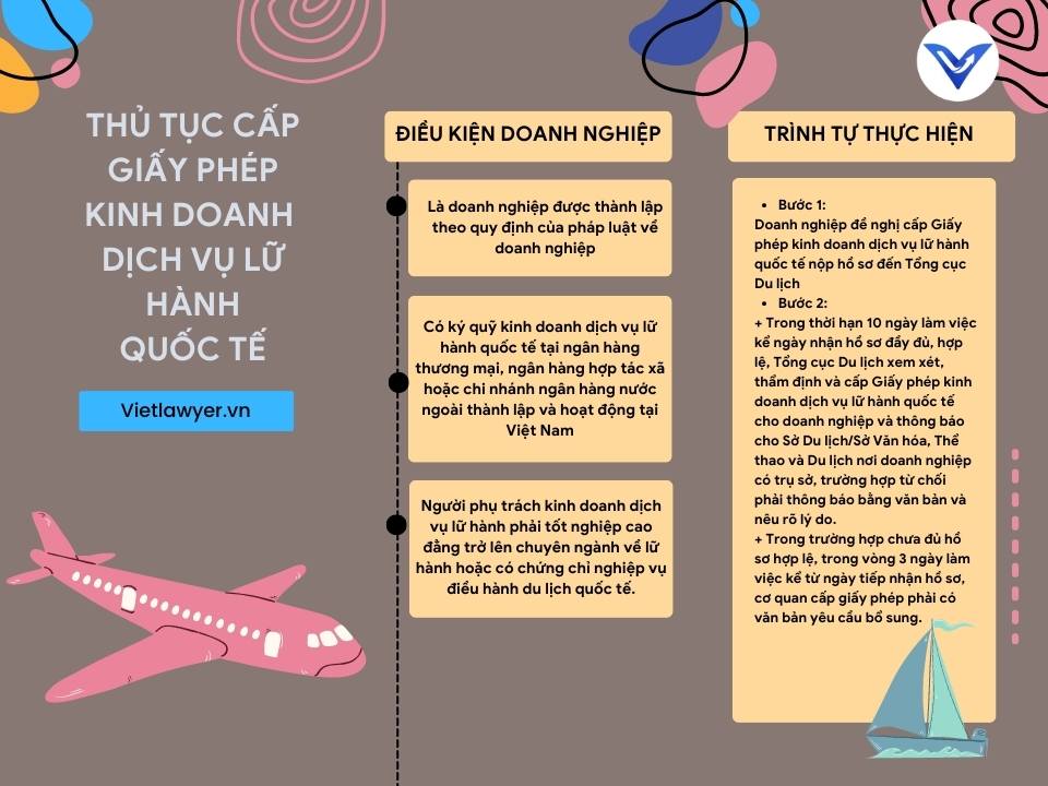 0927625666Thủ tục cấp giấy phép kinh doanh dịch vụ lữ hành quốc tế | Giấy phép con - Kinh doanh dịch vụ lữ hành quốc tế là ngành, nghề đầu tư kinh doanh có điều kiện. Các doanh nghiệp mới thành lập hoặc chuyển sang kinh doanh dịch vụ lữ hành quốc tế cần đề nghị Cấp giấy phép kinh doanh tại cơ quan có thẩm quyền. Công ty luật VietLawyer sẽ cung cấp cho khách hàng về thủ tục Cấp giấy phép kinh doanh dịch vụ lữ hành quốc tế dưới đây.