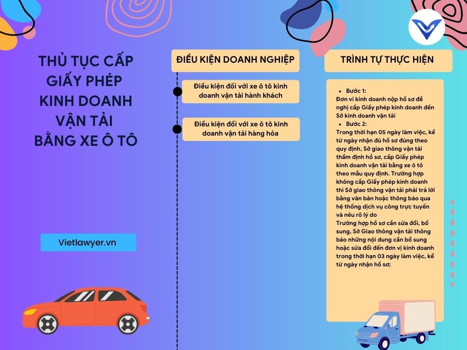 0927625666Thủ tục cấp Giấy phép kinh doanh vận tải bằng xe ô tô | Giấy phép con - Kinh doanh vận tải bằng xe ô tô là ngành, nghề phổ biến nhưng là ngành, nghề đầu tư kinh doanh có điều kiện. Các doanh nghiệp kinh doanh vận tải bằng xe ô tô cần đề nghị Cấp Giấy chứng nhận tại cơ quan có thẩm quyền. Công ty Luật VietLawyer sẽ cung cấp cho khách hàng về thủ tục Cấp phép kinh doanh vận tải bằng xe ô tô.